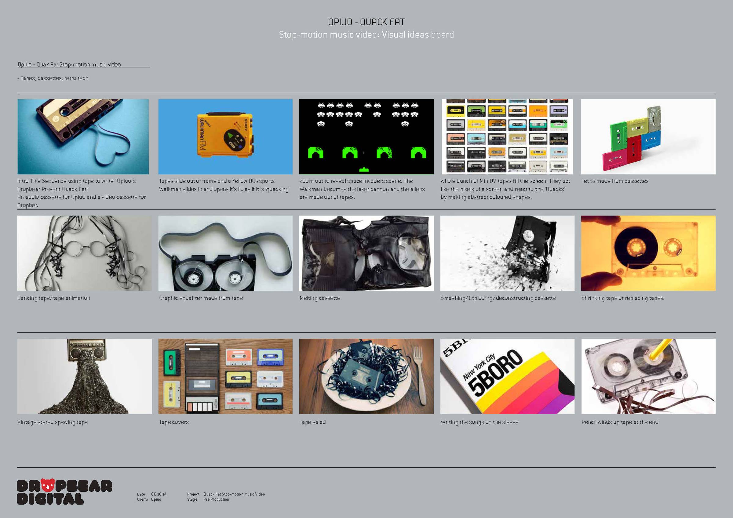 Happy New Year! I hope you had a wonderful holiday season and are ready to dive into another exciting year of stop motion animation. As I look ahead to 2023, I can't help but feel a sense of renewed energy and inspiration for the art form I love. One of the things I'm most excited about for the upcoming year is the continued growth and evolution of stop motion animation technology. With new software and hardware tools becoming available all the time, the possibilities for what can be achieved in stop motion are truly endless. But of course, it's not just about the technology - it's also about the creativity and passion of the animation community and artists that are pushing the boundaries of what's possible. I'm always in awe of the incredible artistry and storytelling that goes into stop motion animation, and can't wait to see the new works that will be created in the year ahead. Quack Fat - Behind the ScenesI thought I'd dig into the archives and give you a peak behind the curtin on the making of one of my favourite projects; Quack Fat. This music video I directed and animated for EDM producer Opiuo, took 5 months to make and used over 240 audio cassettes, 5,600 feet of video tape, 108 floppy discs and 1 retro walkman. Pre ProductionAs you may have already guessed I love retro tech, so I decided to create an animated music video using some of the objects I grew up with such as audio cassette tapes, VHS and Walkmans (yes I'm showing my age). I decided to use these objects to recreate classic classic video games – including Tetris, Space Invaders and Breakout. Another key element was to synchronise the visuals to the music. Therefore planning was key. I usually start my projects with research in the form of a mood board and jot down ideas for key parts of the animation. I had to source a lot of the cassettes from second-hand shops. Over 240!! You'd be surprised that they were quite hard to find. I suppose cassettes aren't as popular as they used to be. They also had to be painted in the chosen colour palette. The other items that needed to be constructed were the coloured pyramids that I used to represent sonic elements of the track. I used replacement animation to make them grow up and down. This technique involves changing out an object with another object between frames which required different sized pyramids in each colour. ProductionOnce I had prepared all the objects it was time to get animating. Each scene needed to be lit, timed out to the music and camera ready for the shots required. This process took many many hours in the studio. You can watch a time lapse of the whole process here Exploding WalkmanThe exploding walkman effect was achieved by making a series of yellow and black cubes out of card that closely matched the dimensions and volume of the actual walkman. These were swapped out and put in the exact same place as the original Walkman and animated in a fast outward motion. BoomboxFor the boombox scene I replaced the speaker cones with custom 3D printed cylinders that could be animated individually creating the telescopic effect. RiggingSome shots required rigging so they could be suspended for animating, Such as the final shot of the cassette tape being rewound by the pencil. The rig was painted out frame-by-frame in post. I hope this gave you an insight into how I brought this ambitious music video to life. As you can see stop motion animation requires many skills, such as concept development, art-direction, practical craft, problem solving and a lot of patience. I'm looking forward to sharing more insights, tips and tricks about the craft of stop motion with you. Here's to a great 2023! Bye for now Dropbear ʕ•ᴥ•ʔ Dropbear EmporiumOriginal prints by Dropbear at the Dropbear Emporium |